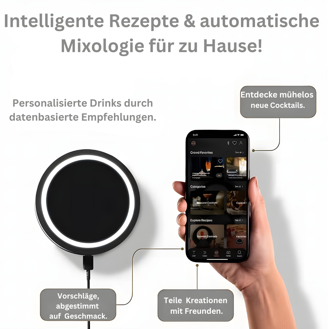 Mit dem Gerät lassen sich Cocktails und Mocktails automatisch und präzise zubereiten, ohne manuelles Abmessen. Über die App erhält man Schritt-für-Schritt-Anleitungen und personalisierte Rezeptvorschläge. Das Gerät ersetzt mehrere klassische Barwerkzeuge und vereinfacht den gesamten Mixprozess. Ideal für Hausbars, Partys und alle, die gleichbleibend perfekte Drinks genießen möchten.